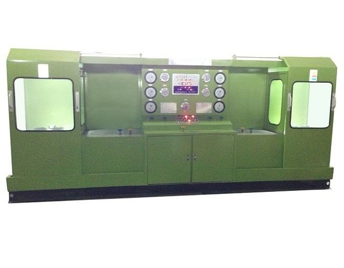 本机由液压系统、机械部件,电器控制及多极气源升压装置系统等部件组成。液压系统是本试验台的动力主源。用于各类液压缸和机械件驱动执行功能。试验面夹爪由液压缸直接驱动执行,轴向夹紧压力是按阀门试验压力等级不同进行调节增压(最高液压增压压力31 5MPa)。各夹爪受力均,夹紧可靠。径向移动由液压缸传动执行,各夹爪进退同步,灵活自如,确保通径大小不同阀门的测试。多极气源升压装置是利用液气联动增压。增压范围0.6—32 0MPa,用于阀门介质压力试验。气源升压工作设有自动和手控二种操作选择,当选用自动升压工作时,工作人员可以近距离离开操纵台观察现场试验情况。