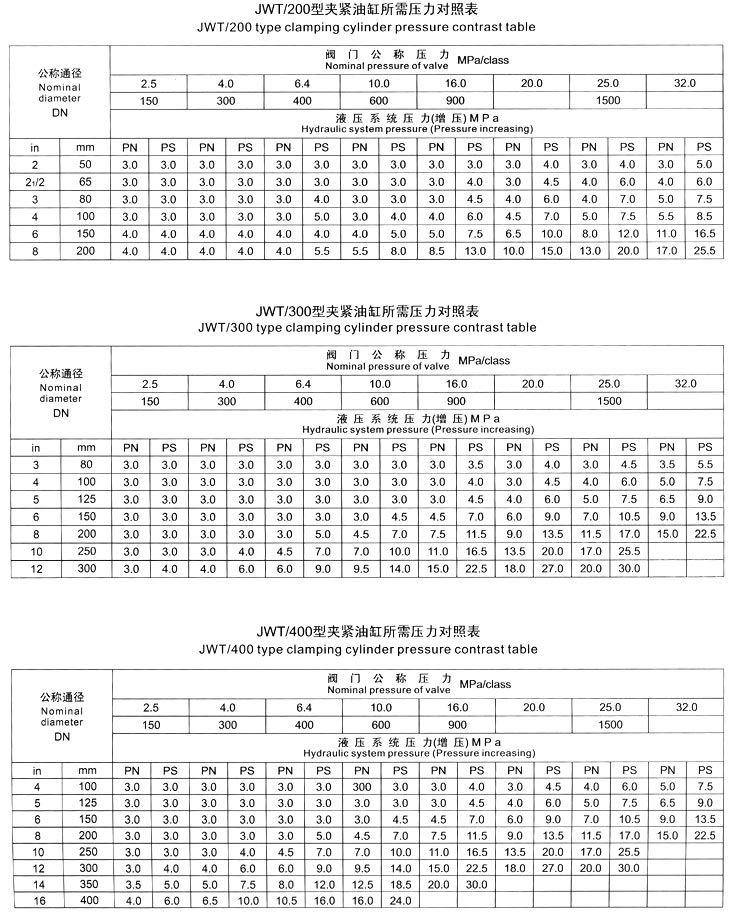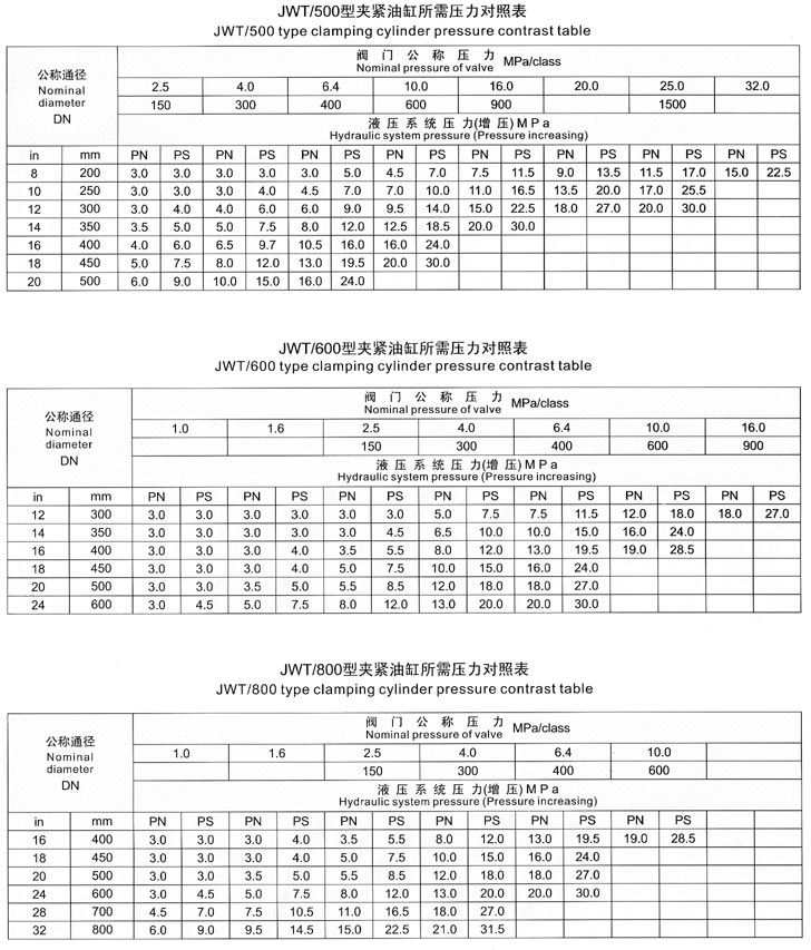 五、测试阀门时,首先根据被试阀门试验要求参照《压紧油缸所需压力对照表》进行试验压力增压调节。严禁增压超高压工作。防止被试阀门变形损坏。
